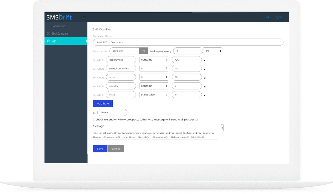 Built text messaging workflow automation in SMS Drift. Automate processes by automatically triggering text message to your Pardot leads based on the rules that you create. Each message will be personalized with the contacts personal information such as name, company name etc.